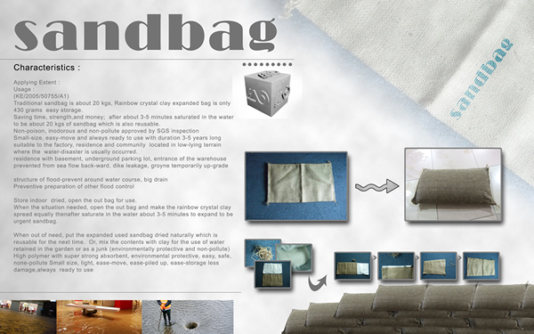 Традиционный мешок с песком около 20 Кг, расширяемый мешок с кристальными почвами только 430г . Он очень удобрен и легок для сохранения. И поэтому это может экономить много времени, рабочей силы и денег. Только нужно положить его в воду 3 до 5 минут, и можно получить мешок около 20 Кг. Если сравнивают его с традициоднным мешком с песком , У него ряд преимущества. Вопервых , он мальнкий и легенький, поэтмоу он легко двигается и можнл сразу используется, есть произошлось аварийная ситуация. Вовторых, он безвредный , без запаха ,беззапахный и эоломический. Он уже успешно сдал инспекцию SGS. Важнее чем всего, он может повторно пользуется 3 до 5 лет.